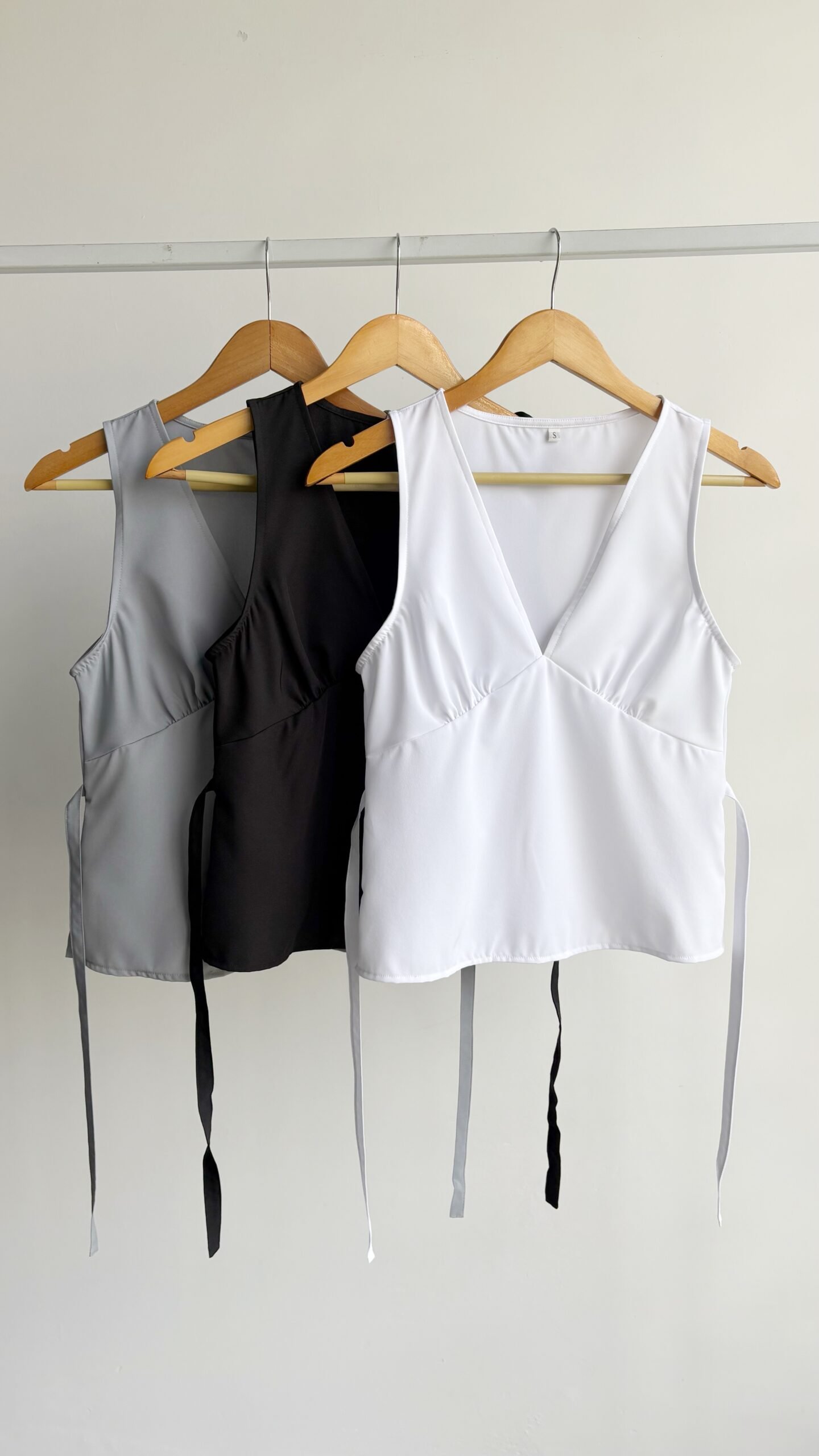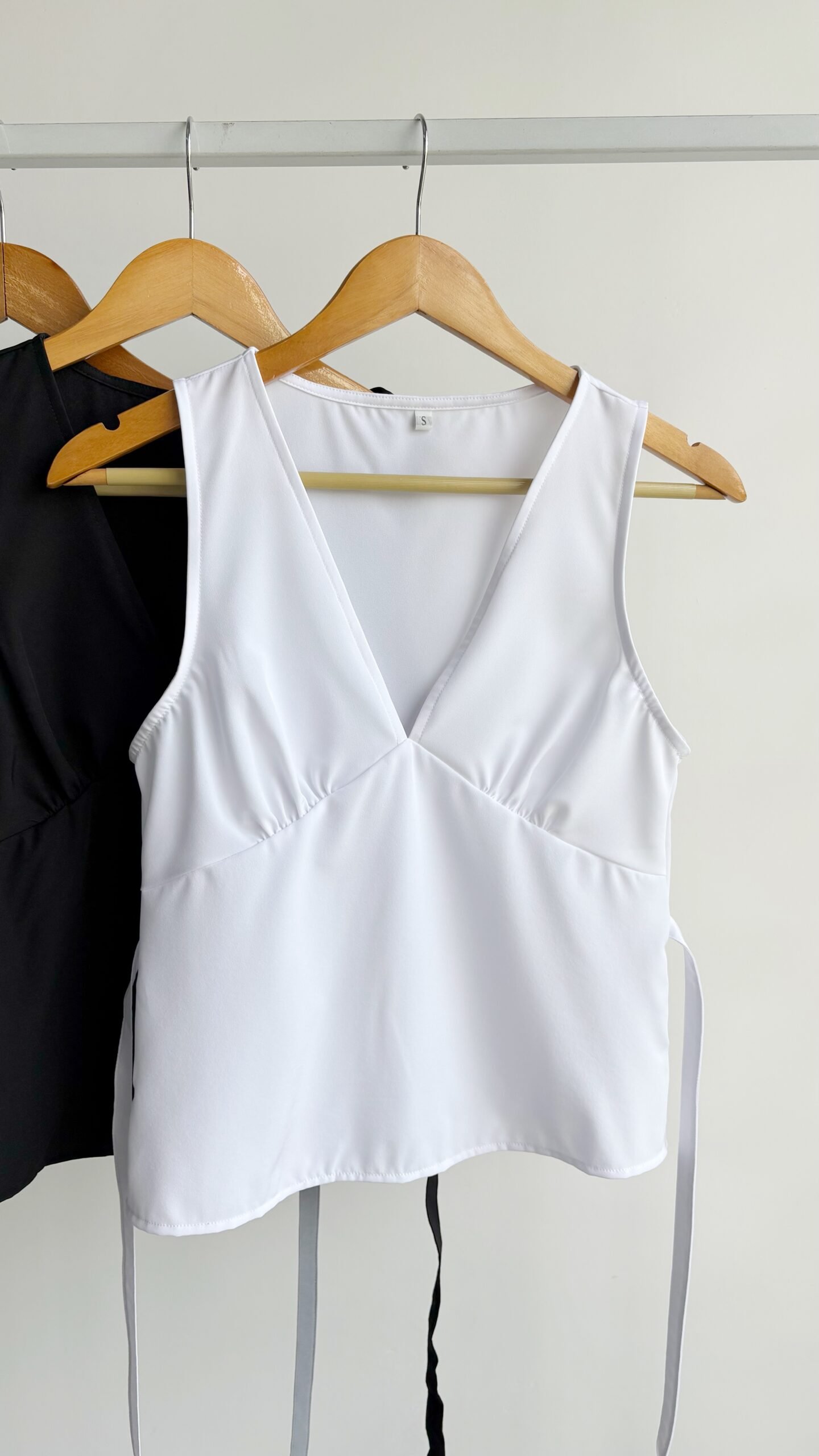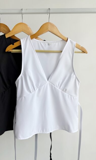 Musculosa de tela fourway (sastrero fino), escote V con tiras para atar en la espalda.