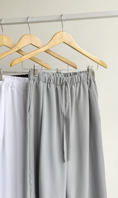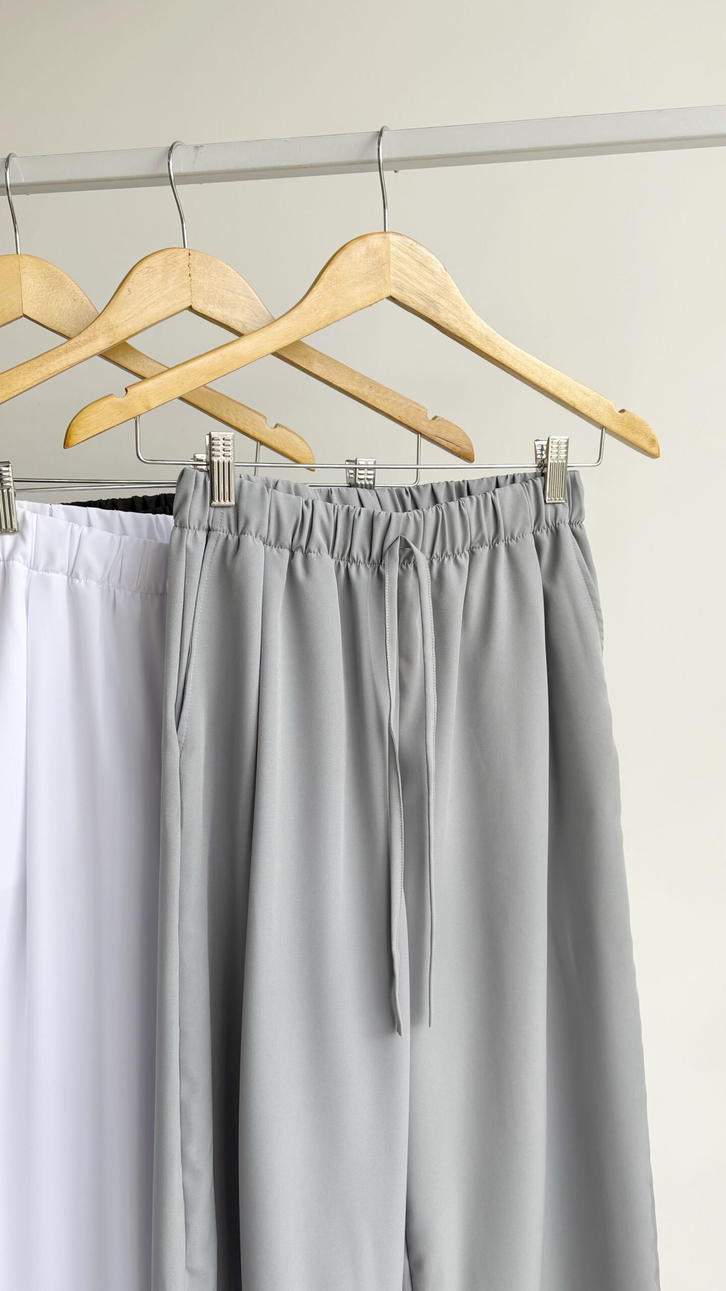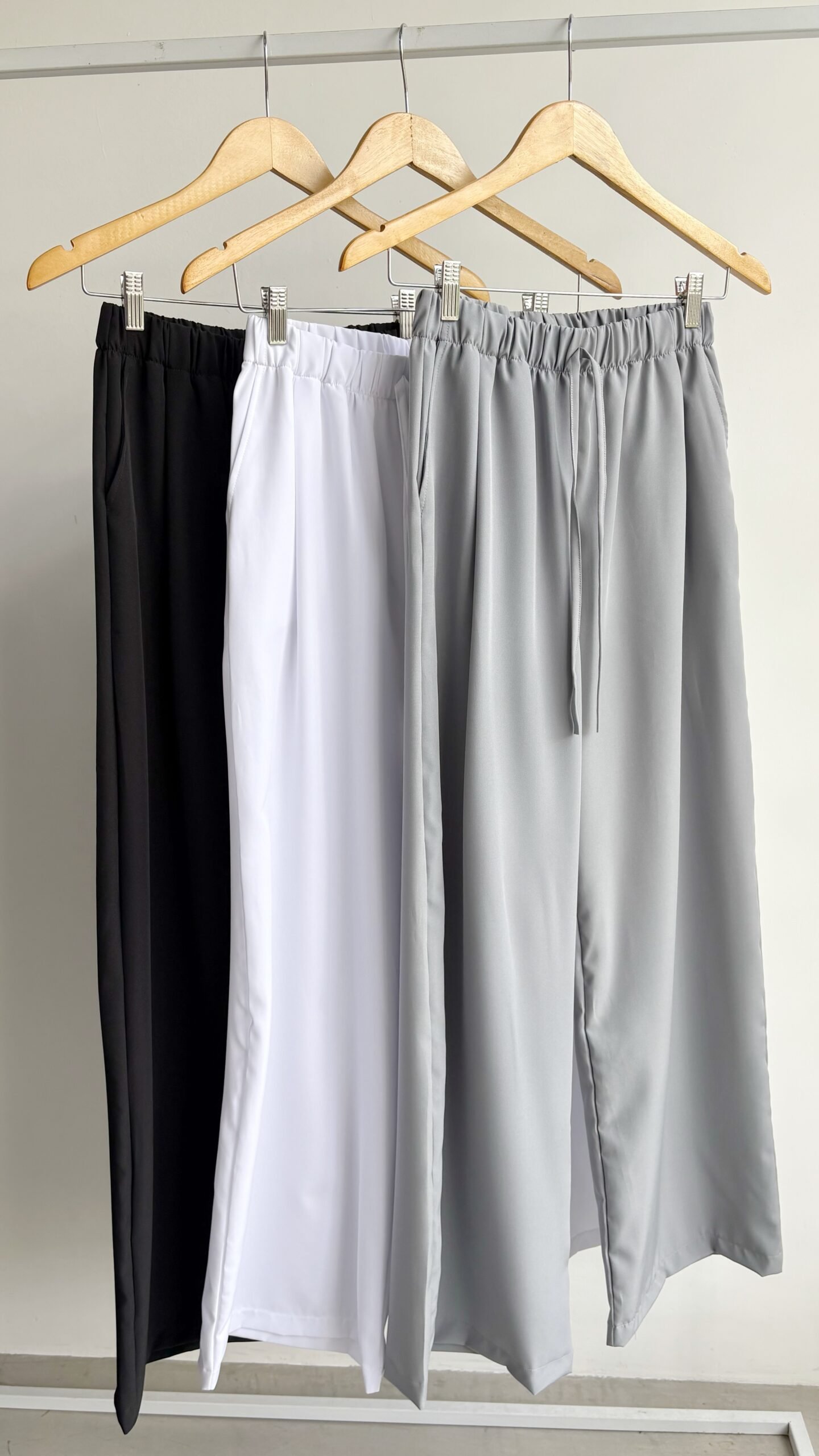 Pantalón ancho de tela four way (estilo sastrero con un poco de spandex), con elástico en la cintura. Detalle de pinzas y bolsillos laterlaes.