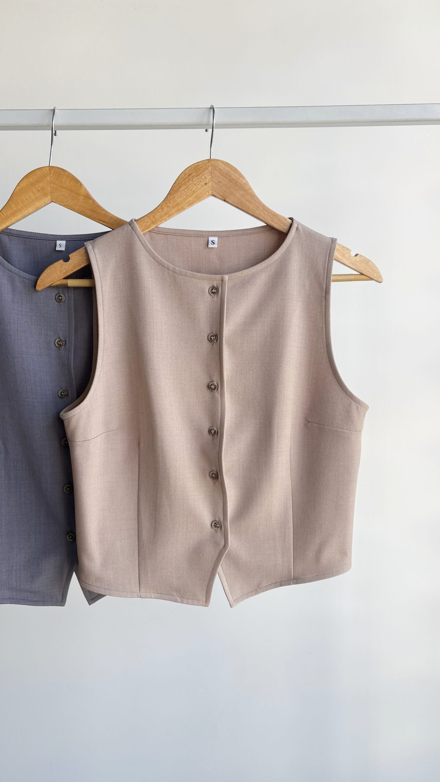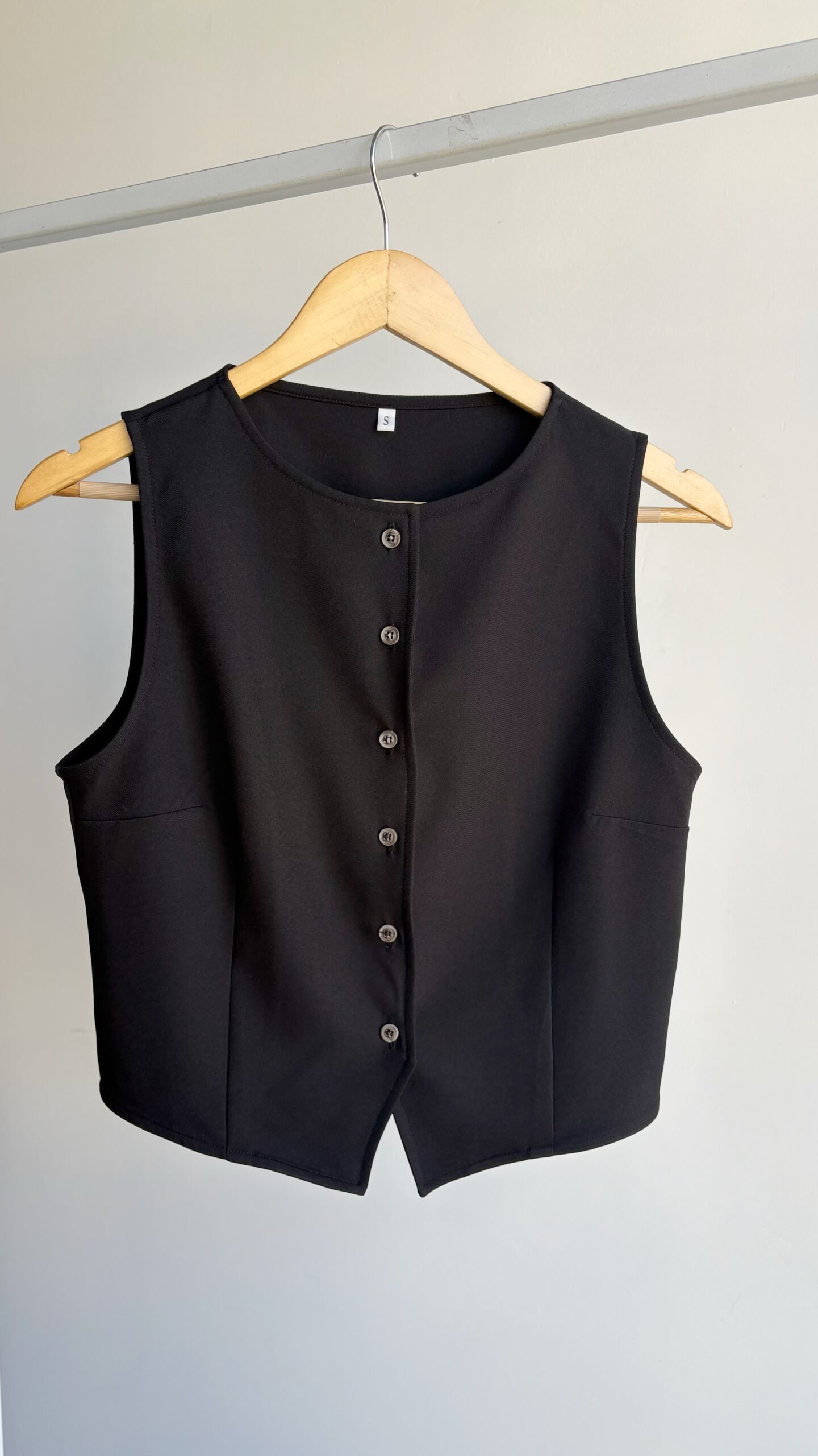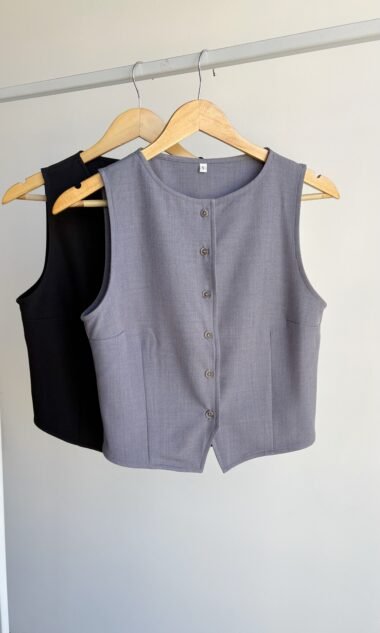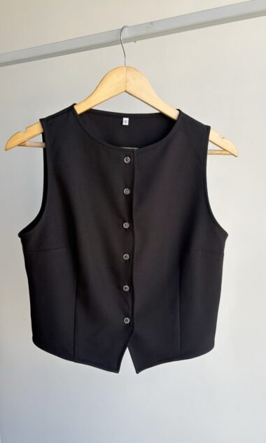 Chaleco de tela sastrera rígida, cuello redondo con botones.