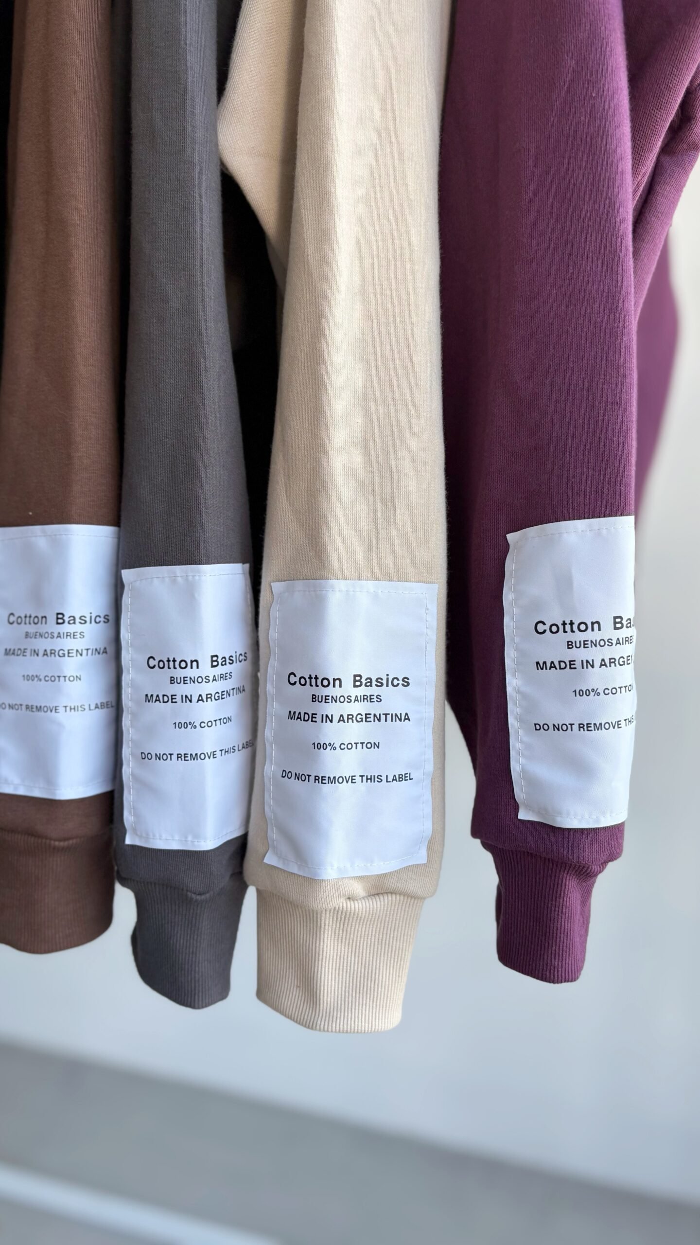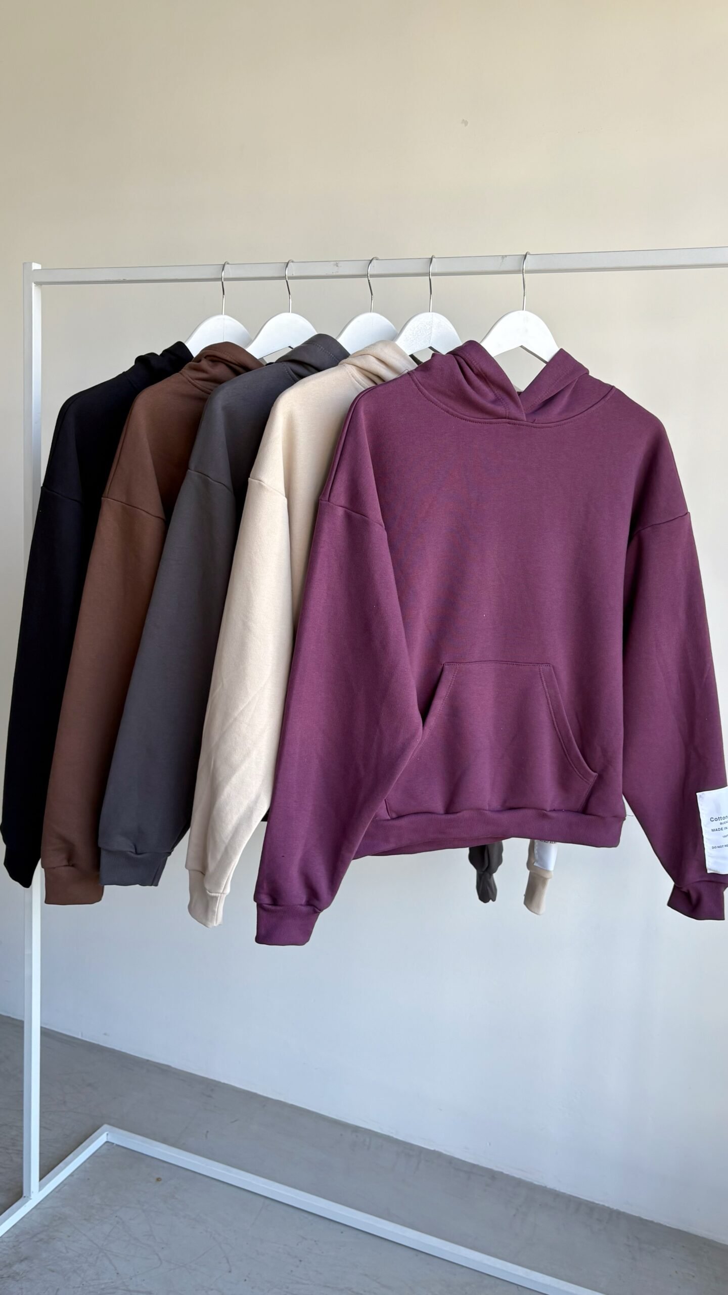 Buzo oversize con bolsillo canguro y capucha simple, de 100% algodón. Detalle de etiqueta en la manga.