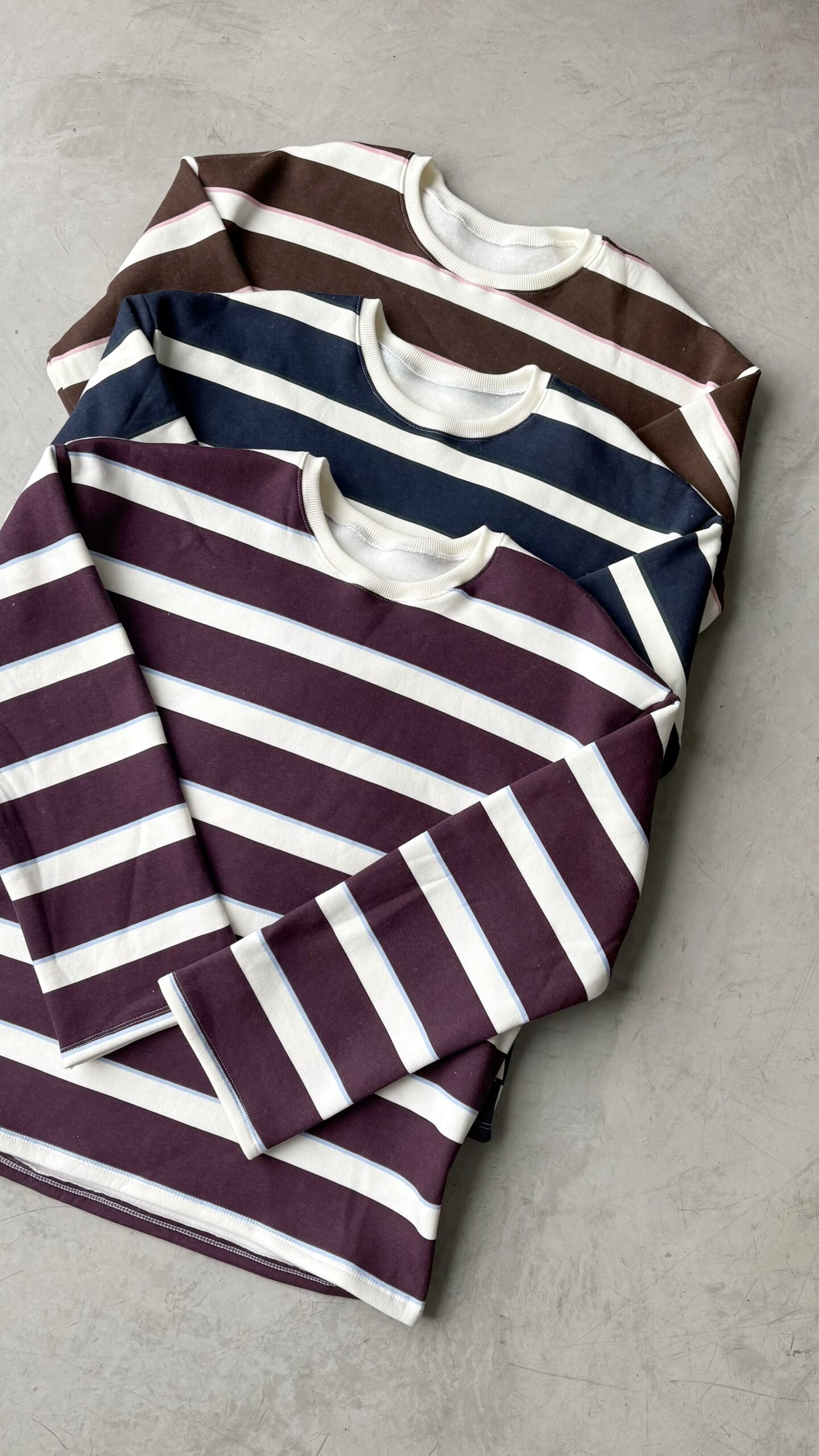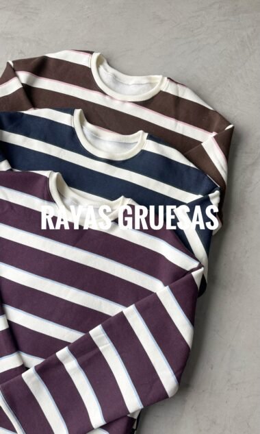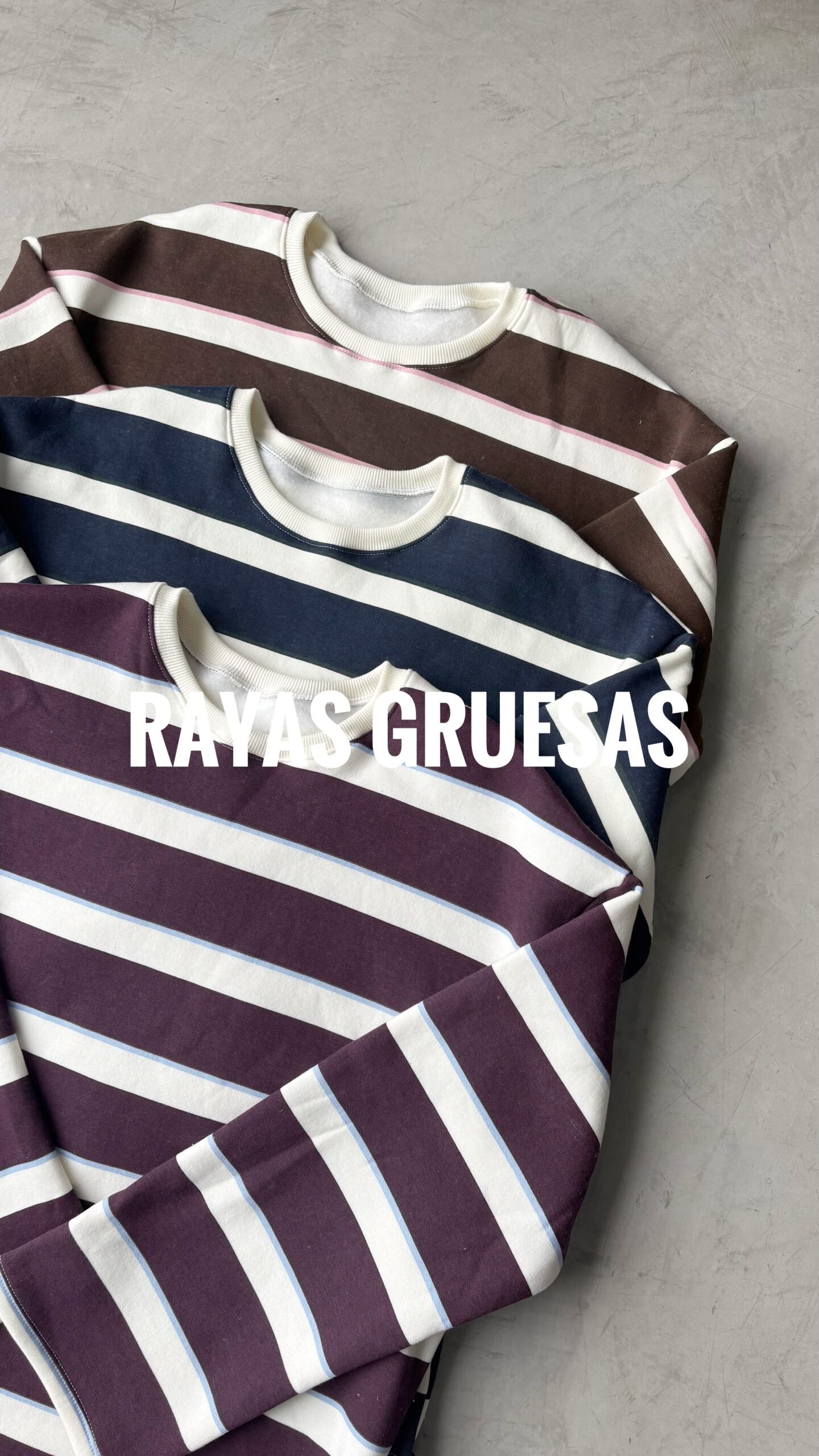 Buzo cuello redondo de friza rayada (bien gruesa), modelo oversize. Talle único amplio, abarca hasta talle L.