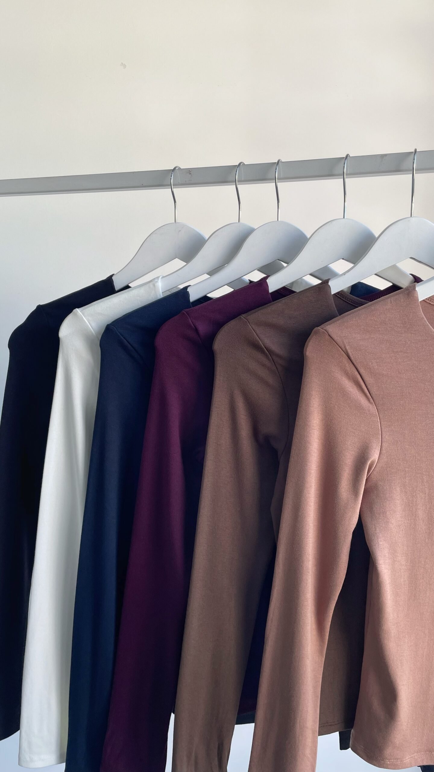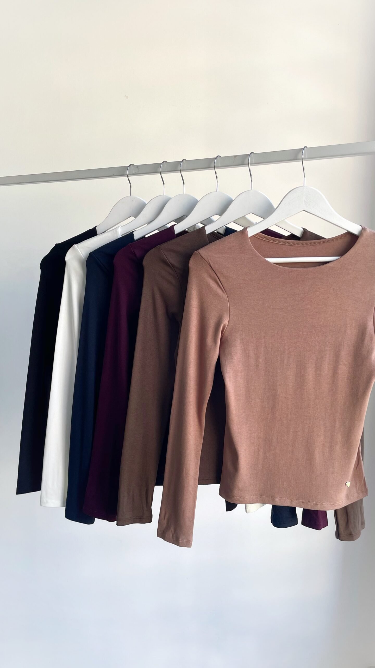 Remera básica manga larga de tela hermes (viscosa 1×1), cuello redondo con vista y dije. (Tiene muy buen rebote)