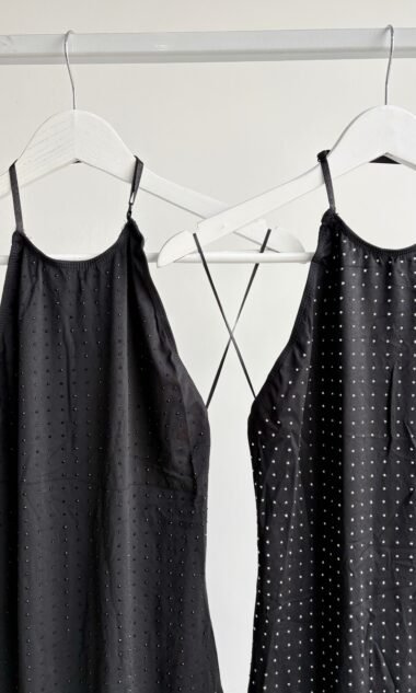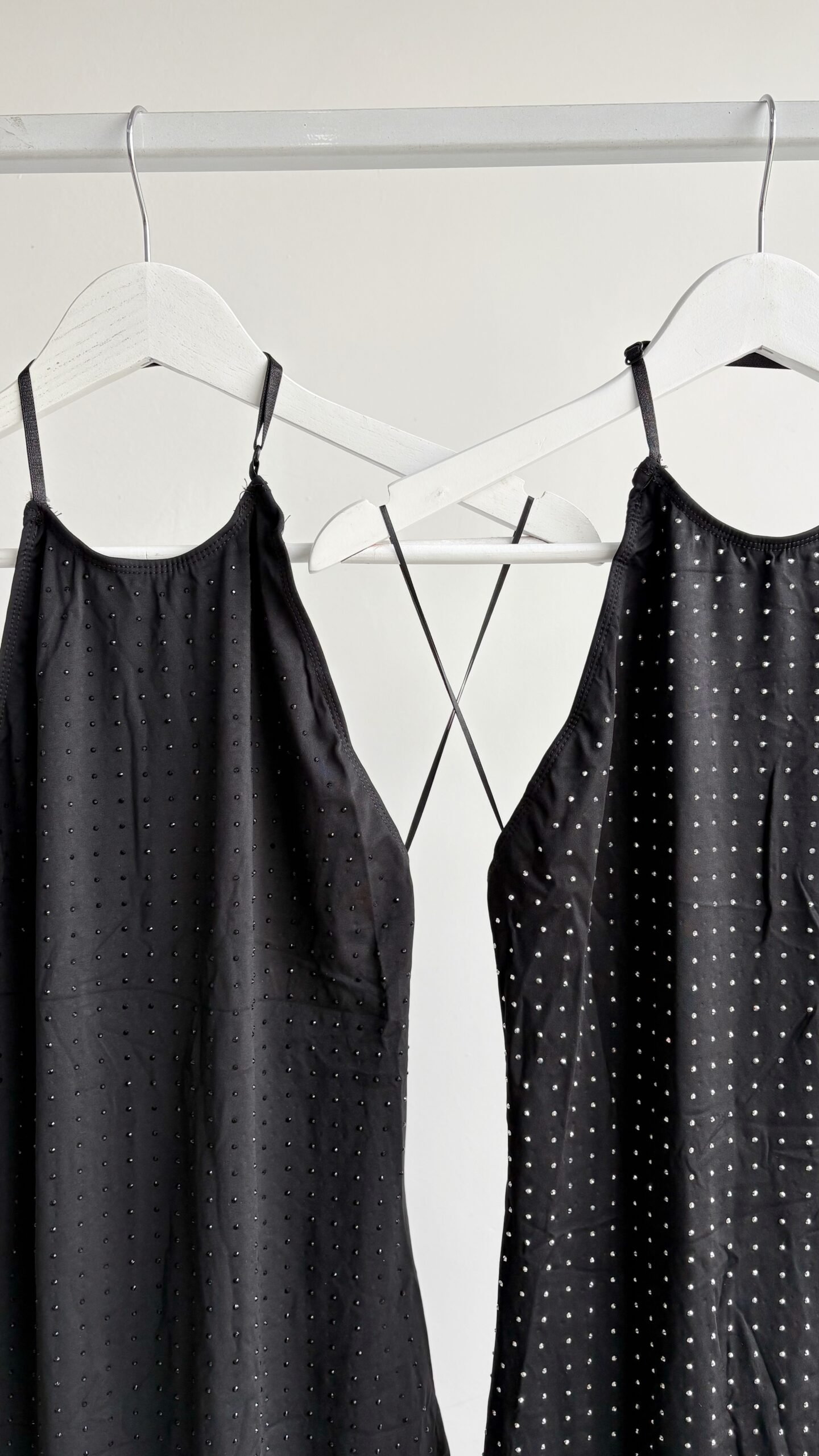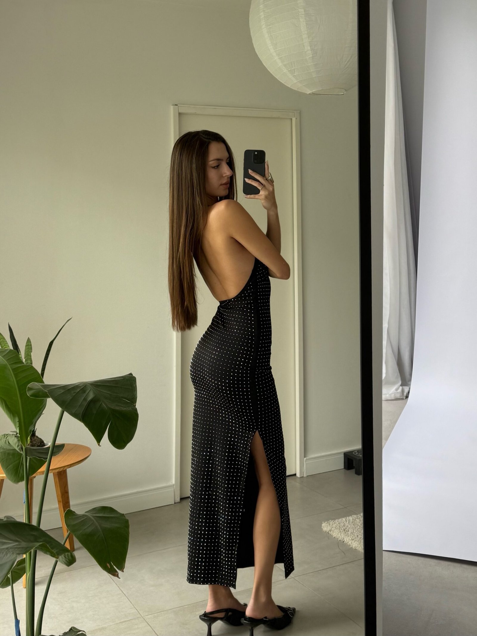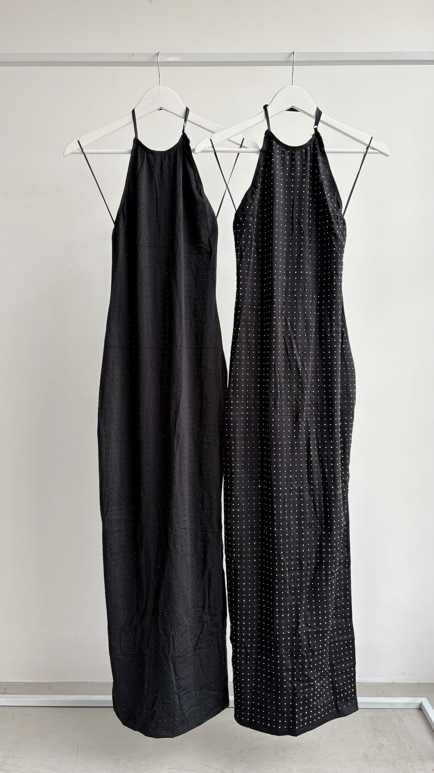 Vestido largo con tira en el cuello regulable. (full strass frente y dorso)