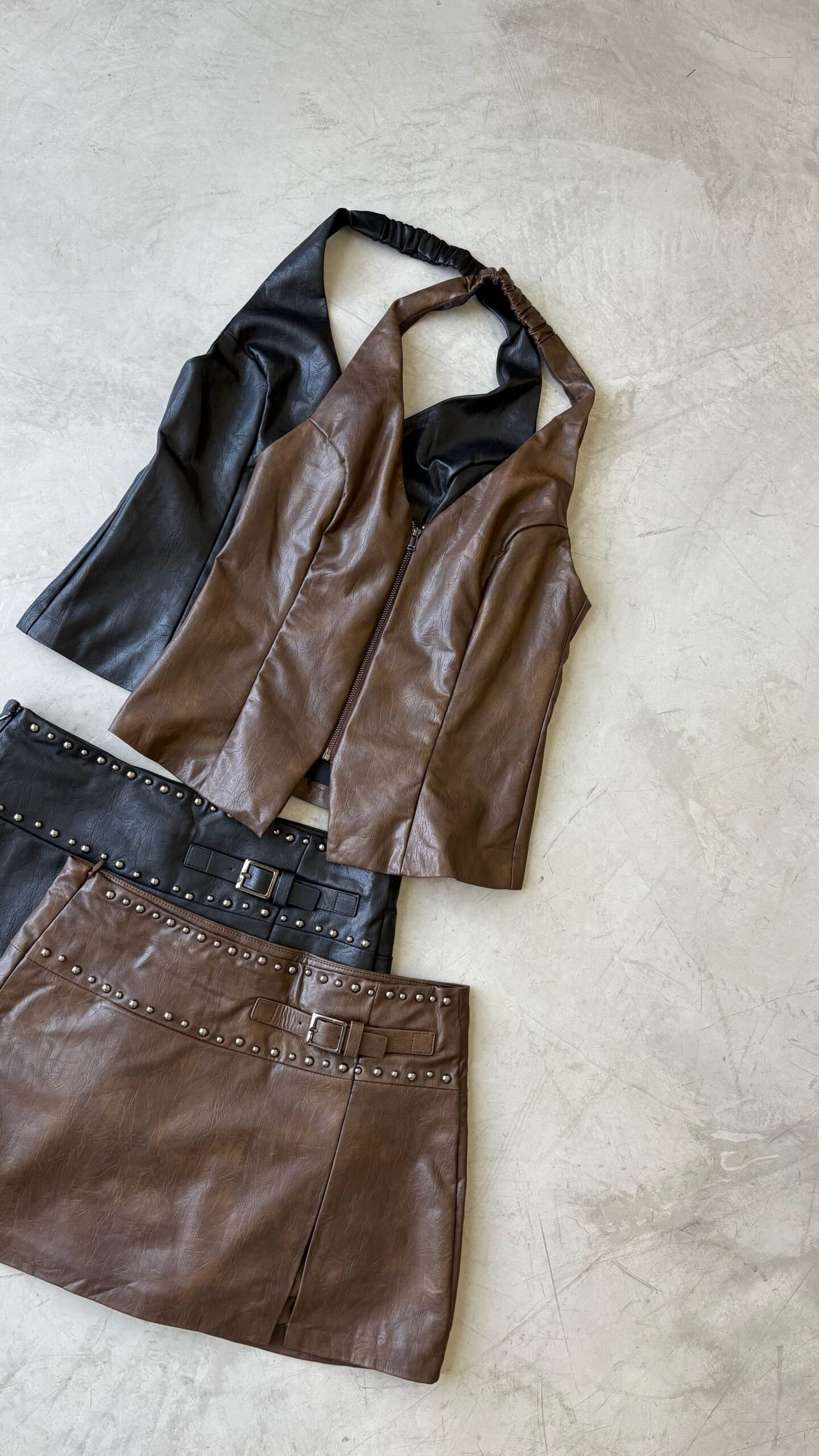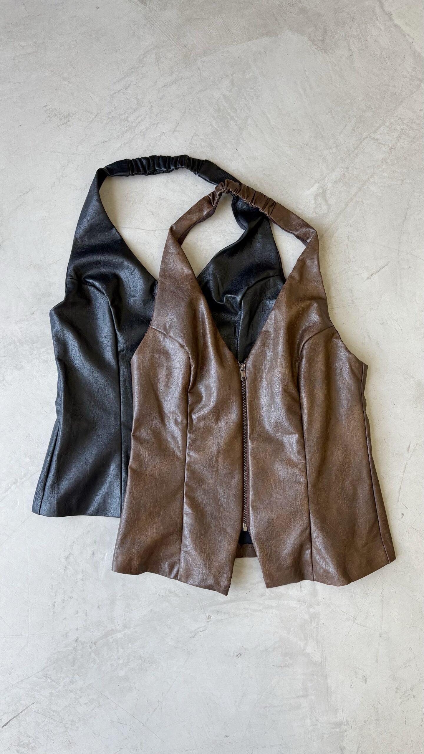 Chaleco halter de simil-cuero, con cierre y elástico en el cuello. Forrado en la parte delantera.