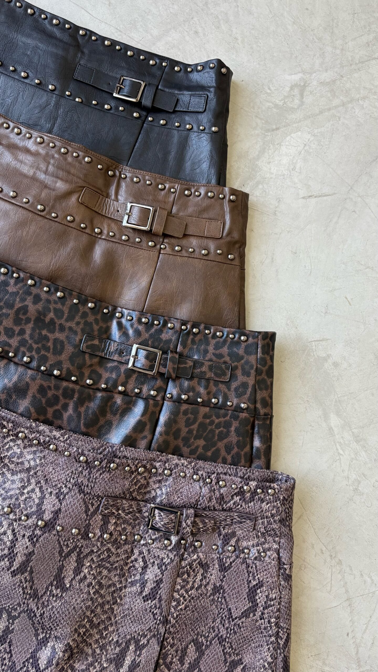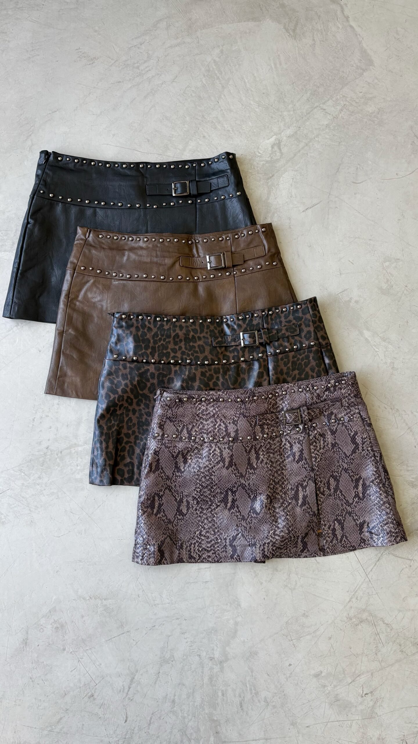 Short pollera de simil-cuero, con cierre invisible, detalle de hebilla y tachas. Short de la misma tela.