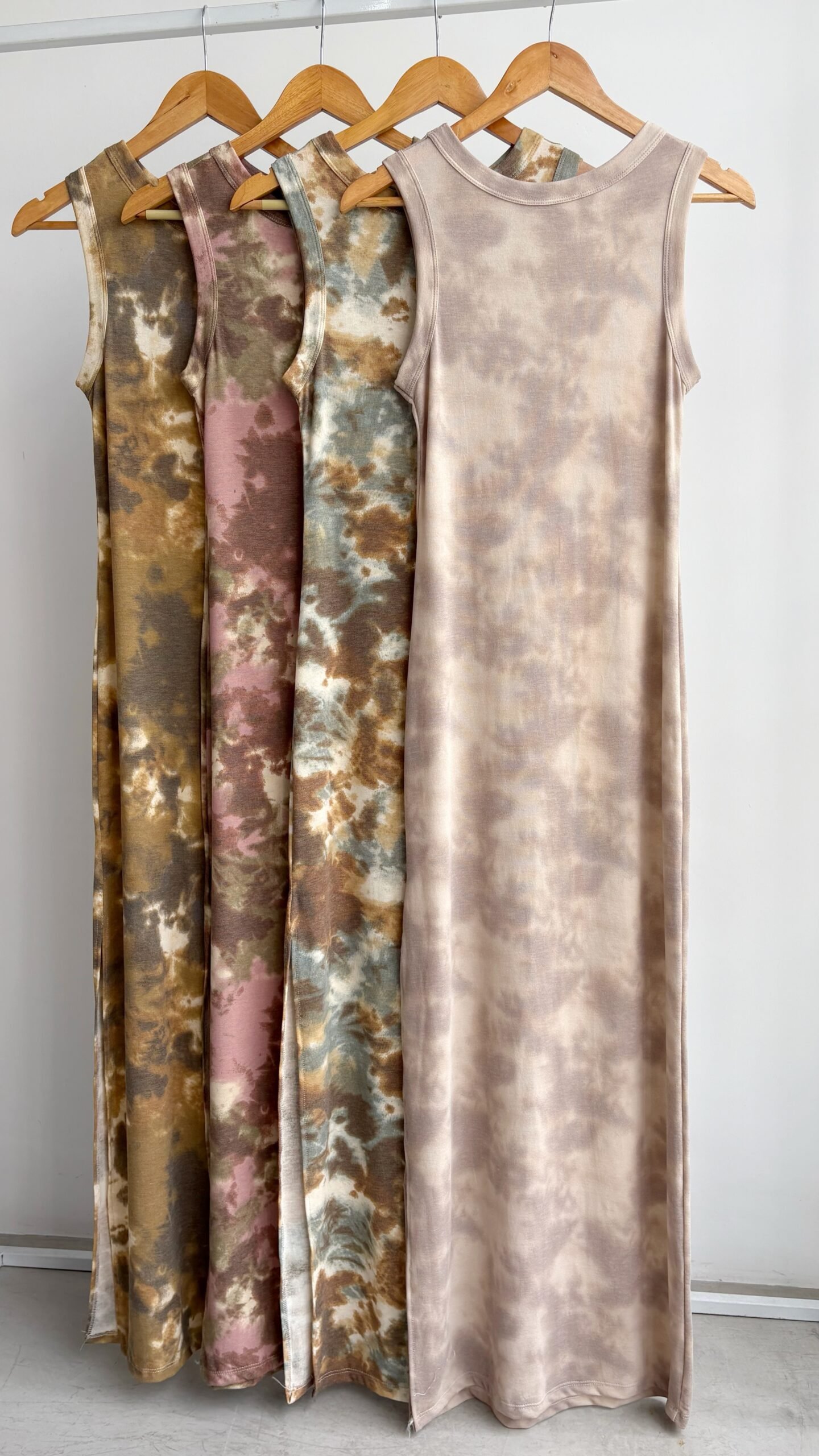 Vestido largo cuello bote con tajo lateral, de tela bremer fino estampado tipo batik (muyy buena elasticidad).