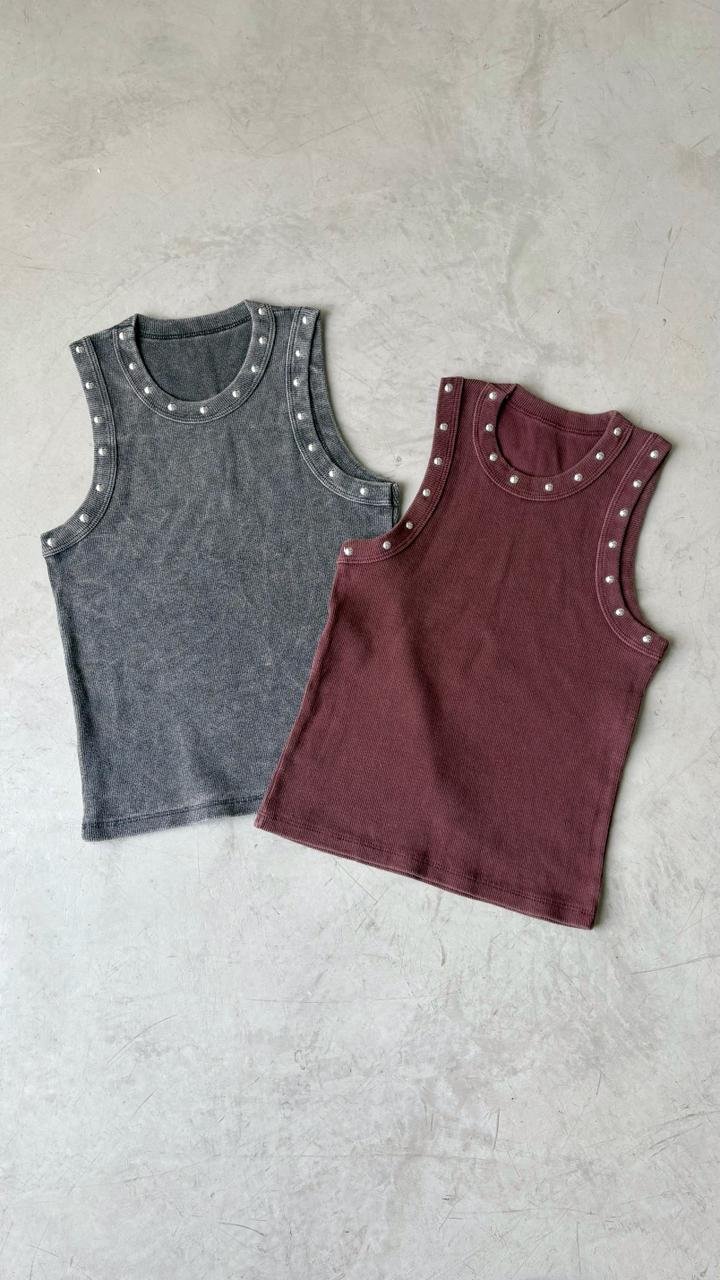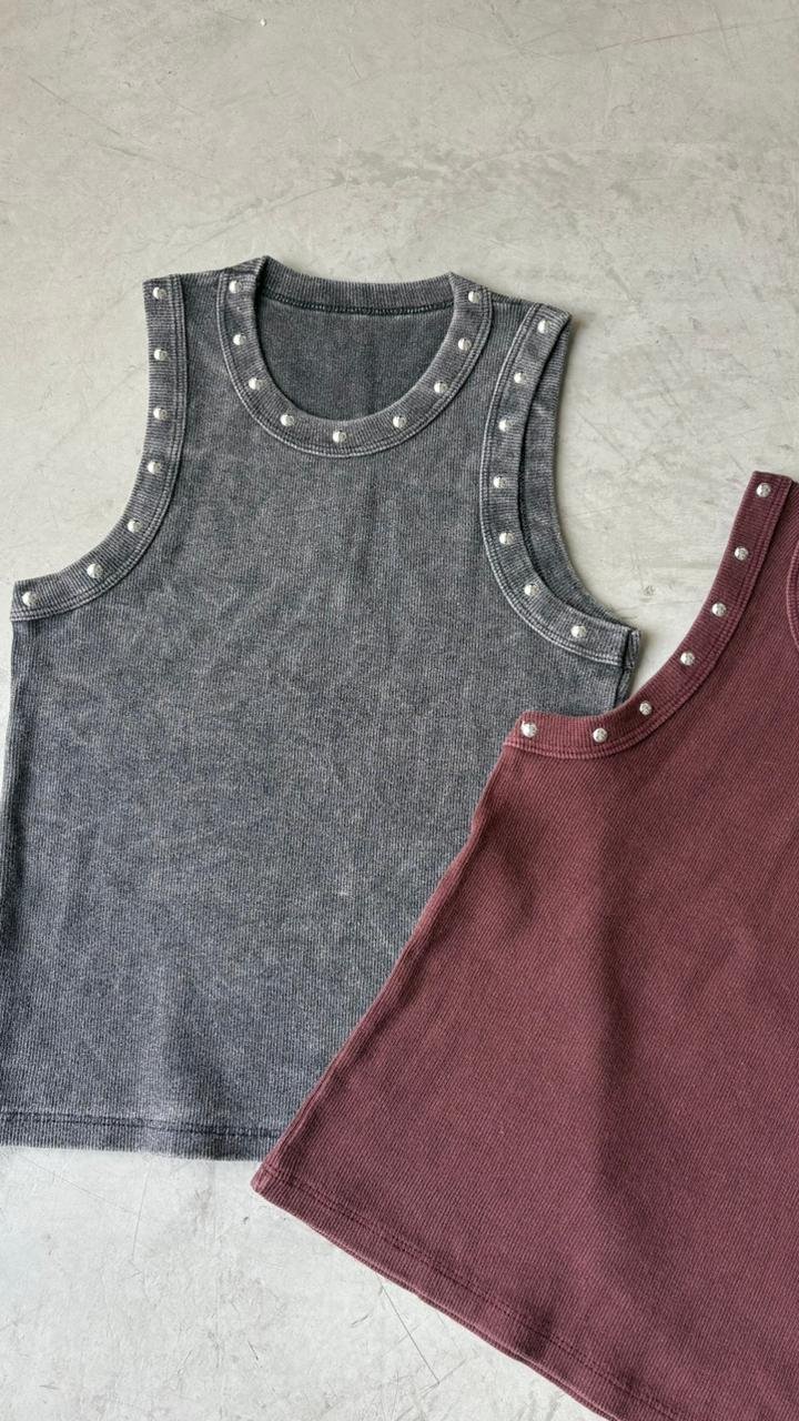 Musculosa top, de morley algodón con efecto wash, detalle de tachitas.