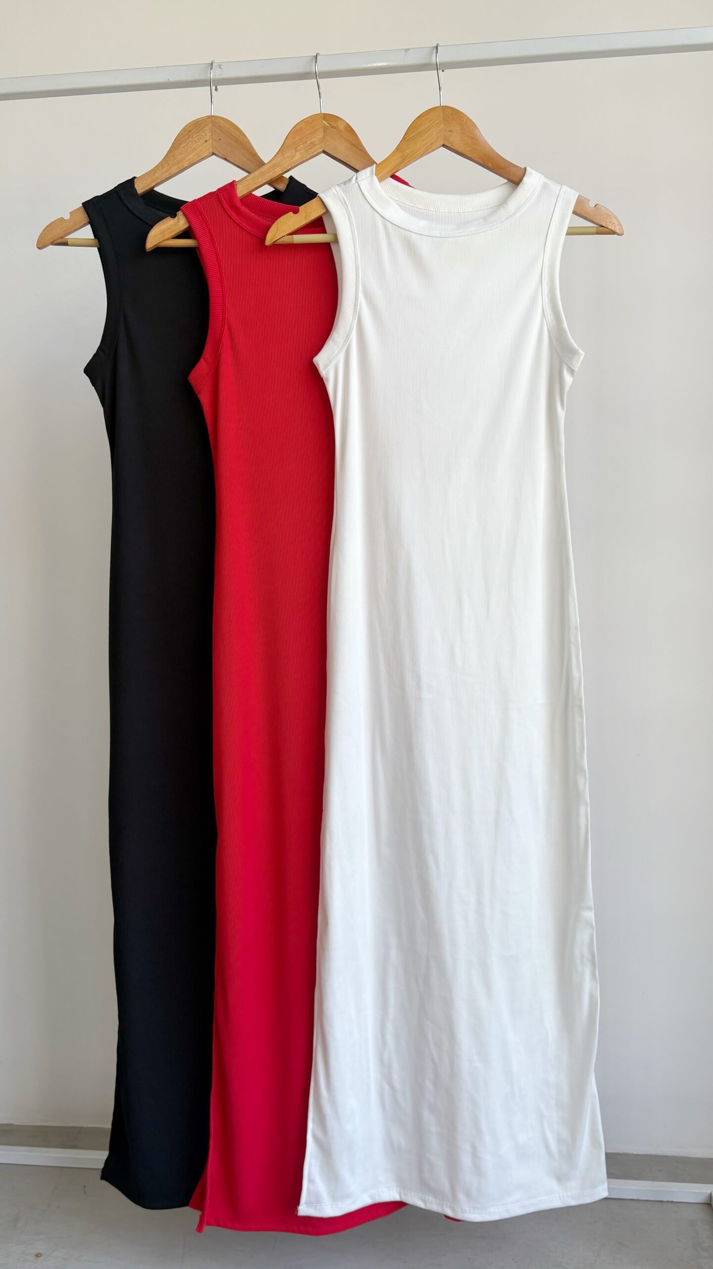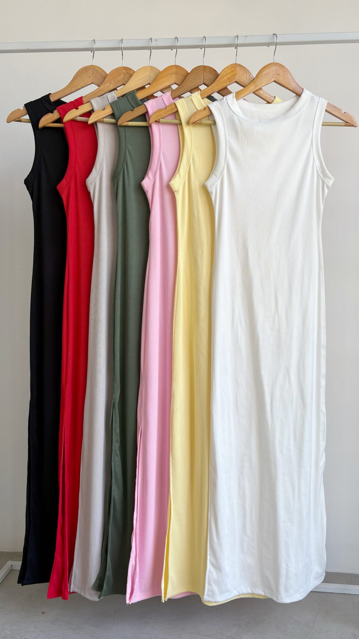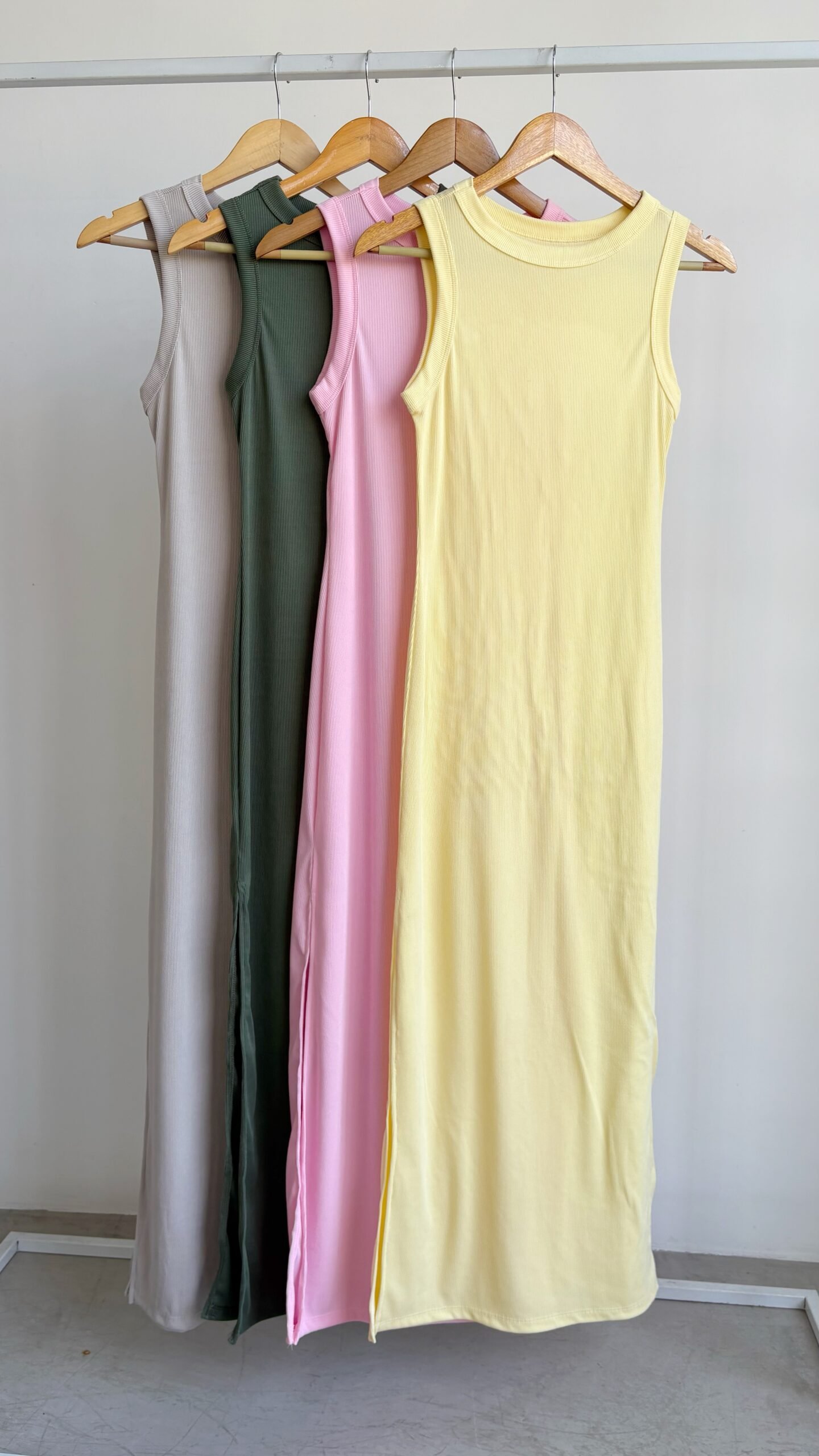 Vestido largo de morley soft, con cuello bote y tajo lateral.